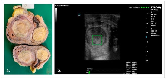 In veterinary medicine, the use of SWE for the assessment of focal lesions in several organs has been reported. In canine mammary glands, benign neoplasms were softer than malignant ones [38,39,40], although SWE was not specific for the differentiation of carcinoma type or grads [41]. In dogs with head and neck cancer, higher SWS values were found in metastatic medial retropharyngeal and mandibular lymph nodes [42]. Moreover, 2D-SWE showed a diagnostic accuracy of 97% in the differentiation of malignant and benign splenic lesions in dogs, with malignant lesions being stiffer than benign ones and healthy parenchyma [43]. However, studies on the use of elastography for the assessment of testicular stiffness are still limited. In dogs, SE showed significant correlations between testicular stiffness and the quality of the semen collected from the epididymis [44], and SWE baseline values for healthy testes were reported both for pSWE and 2D-SWE [45,46]. In addition, some testicular abnormalities were described by pSWE [47], and 2D-SWE has been applied to differentiate leydigomas from non-neoplastic testicular lesions, showing significant differences [48]. However, the number of dogs and lesions evaluated is still limited and the diagnostic potential of SWE techniques in the assessment of testicular disease must be better addressed.