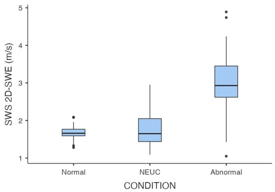 Significant differences were found between the SWS values in normal testes, NEUC areas, orchites, and testicular tumors (p < 0.001); pairwise post hoc tests confirmed the statistical significance of these differences (p < 0.001), except for the SWS values in orchites and tumors, which did not differ significantly (p = 0.999).