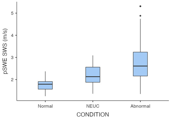 Box plot of average SWS values measured by pSWE in normal, NEUC, and abnormal testes. The boxes and vertical lines represent, respectively, the 95% confidence interval for the mean and the range values; horizontal lines represent median values; spots represent outlier values.