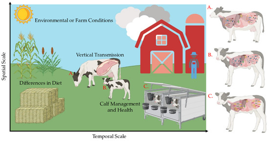 Mammals and microorganisms have evolved a fundamental, symbiotic relationship crucial to mammalian life that is known as the microbiome. The microbiome is the collection of all microbes and the genomes that naturally inhabit their host. Host–microbe interactions influence both the host and its microbial partners. Currently, a large effort to characterize animal-associated microbial ecologies has resulted in an improved understanding of the importance of the microbiome [1]. In humans, studies have indicated the importance of the microbiome to health [2,3,4], digestion [5], growth and development [6], and behavior [7,8]. In parallel, recent research has increased the understanding of the microbiomes of domesticated livestock such as dairy cattle. Research efforts in dairy cattle have revealed the relationship between the microbiome and diet [9], methane emissions [10], stress and physiology [11], and overall health [12,13]. The vast importance of the dairy cow microbiome has given way to a significant effort to understand how their microbial partners establish and assemble. In humans, and likely in all mammalian life, microbial establishment is thought to begin at the time of birth via vertical transmission governed by various stochastic forces [14]. Similarly, early-life gut microbiomes in dairy calves assemble in the same stochastic manner with variations in composition due to vaginal birth or Cesarean section birth [15]. While the establishment of the early dairy calf microbiome is beginning to be understood in greater detail [15,16], the colonization of early-life microbiomes is a complex process involving both the host and its surrounding environment. Thus, further investigation is crucial to fully understanding the establishment of the dairy cow microbiome.