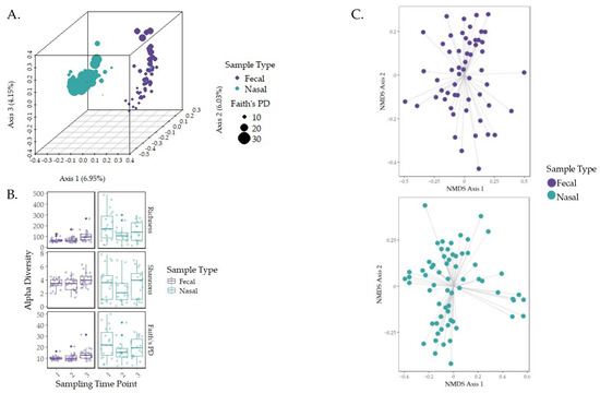 Alpha and beta diversity metrics for nasal and fecal samples over the sampling time frame. Community assembly was also assessed. (A) Beta diversity of each sample type distance was measured using unweighted UniFrac distance and revealed that separation was driven between sample type. (B) Alpha diversity was measured using Faith’s PD, Shannon’s Index, and richness, with statistical significance analyzed using Kruskal–Wallis pairwise testing across the three sampling time points [61]. (C) The ordination of community compositions based on βRC dissimilarity distance is represented by NMDS plots.