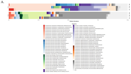 We then evaluated whether different taxa were driving microbial community structure for healthy calf and diarrheic calf groups. Fecal samples were filtered into either the healthy or the diarrheic group using the QIIME2 filter-samples plugin and analyzed. The Dirichlet multinomial model (DMM) was used in R (“DirichletMultinomial” package) to identify key changes in microbiome development at the genus level. The DMM method utilized the lowest Laplace approximation score to cluster samples based on microbial structure similarity. The top three genera with the highest approximation scores were considered main drivers of microbial community structure for each group (i.e., healthy and diarrheic) [22,56,57]. The clusters were tested for significance against the Bray–Curtis distance matrix with PERMANOVA using the adonis2 function within the “vegan” package in R [58,59]. PERMANOVA adonis2 testing used 999 permutations to mitigate Type I error by generating a null distribution. Significant results (p < 0.01) demonstrate that the clusters derived from the DMM are not random and reflect true differences in community structure. Thus, significant results indicate that the top three genera indeed have a role as primary drivers. Similar to NST testing, alpha level was set at 0.01 to reduce false-positive rates, ensuring only biologically meaningful differences were captured. All visualizations were performed with R using the “ggplot2” package in RStudio [60].