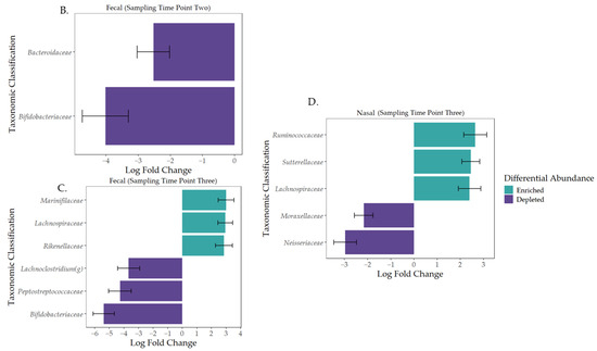 Taxonomy and taxonomic analysis using differential abundance testing (ANCOM-BC). (A) Taxonomic profiles for both fecal and nasal microbiomes using mean relative abundance at the family level across the three sampling time points (1–3) [61]. (B) Differentially abundant fecal taxa at sampling time point two. (C) Differentially abundant fecal taxa at sampling time point three. (D) Differentially abundant nasal taxa at sampling time point three.