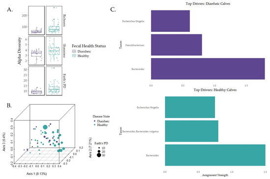 Alpha and beta diversity metrics for healthy and diarrheic calves with the top three community drivers at the genus level. (A) Alpha diversity metrics were measured for fecal samples and health status. Statistical analysis was conducted with Kruskal–Wallis pairwise testing. (B) Unweighted UniFrac distance was used to analyze beta diversity for fecal samples and health status and tested for significance using PERMANOVA pairwise analysis [61]. (C) DMM generated the top three genera for microbial community assembly using the lowest Laplace approximation score for microbial structure similarity clustering.