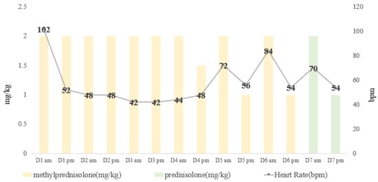 No other treatment was administered for sinus bradycardia. Considering its association with the side effects of corticosteroids, such as increased thirst, frequent urination, and wheezing, cyclosporine (5 mg/kg SID; Sandimmun Neoral®) was added on day 2 as a corticosteroid-sparing immunosuppressant. The methylprednisolone dose was altered such that the dog received 2 mg/kg in the morning and 1.5 to 1 mg/kg in the evening on days 4–6. Bradycardia persisted and appeared to be dosage-related, as it was observed 4–10 h after the administration of IV methylprednisolone at 2 mg/kg. The relationship between HR and methylprednisolone dosage is shown in Figure 2. On day 7, the medication was changed to oral prednisolone at a dose of 2 mg/kg in the morning and 1 mg/kg in the evening. Bradycardia (HR 54 bpm) was also noted 4 h after the dog was administered prednisolone. The dog was discharged in the evening of day 7 with the same dosage of prednisolone as described, and follow-up with regular measurements was recommended (Figure 2).