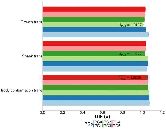 Average genomic inflation factor () when varying numbers of principal components (PCs) are used as covariates in the genome-wide association study (GWAS) for different traits. Growth traits include body weight at 8 and 12 weeks of age; shank traits include shank length and width; and body conformation traits include back length and width.