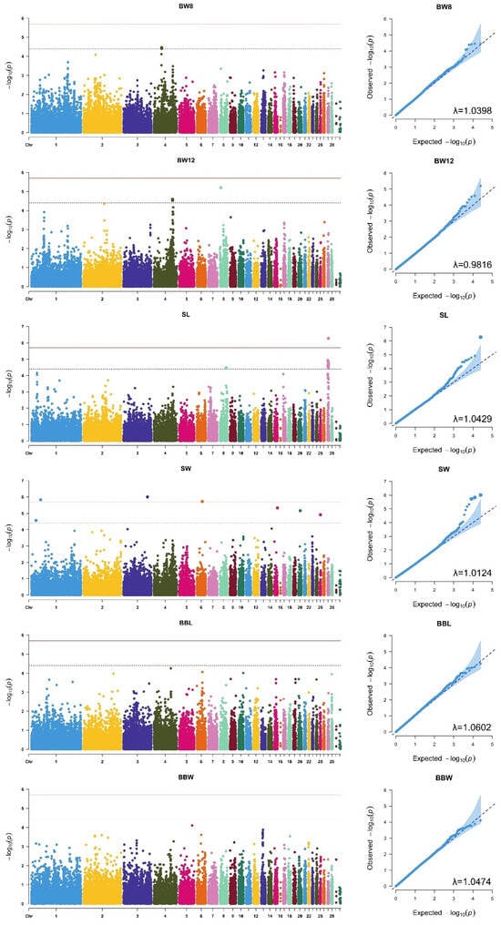 Manhattan (left) and QQ (right) plots of genome-wide association study (GWAS) results obtained using GEMMA software for body weight at 8 weeks (BW8), body weight at 12 weeks (BW12), shank length (SL), shank width (SW), back length (BBL), and back width (BBW). The red solid line represents the threshold for 5% Bonferroni genome-wide significance (p = 2.00 × 10−6 for BW8 and BW12; p = 2.00 × 10−6 for SL, SW, BBL, and BBW). The blue dotted line represents the suggestive threshold (p = 4.00 × 10−5 for BW8 and BW12; p = 4.01 × 10−5 for SL, SW, BBL, and BBW).