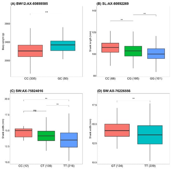 Genotype–phenotype associations revealed significant relationships for these missense SNPs (Table 6). For BW12, individuals with the GC genotype at AX-80898585 exhibited significantly higher body weights than those with the CC genotype (Figure 3A). For SL, individuals with the CC genotype at AX-80892269 had significantly longer SL than those with CG and GG genotypes (Figure 3B). Regarding SW, individuals with the CC and CT genotypes at AX-75824016 displayed significantly wider SW compared to those with the TT genotype (Figure 3C), while individuals with the GT genotype at AX-76226556 also had significantly wider SW than those with the TT genotype (Figure 3D).