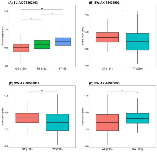 Boxplots of phenotypes for shank length (SL) and shank width (SW) by genotypes of SNP markers with 5% Bonferroni genome-wide significance. The boxes represent the first, median, and third quartiles, with whiskers extending up to 1.5 times the interquartile range. ** above the bars indicates significant differences (p < 0.05) based on Tukey’s HSD test. Numbers in parentheses next to the genotypes indicate the sample size for each group. The total sample size was reduced in some cases because of missing genotyped data for certain individuals.