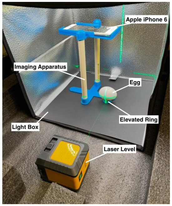 To capture consistent images, an apparatus was built that could hold a smartphone at a fixed distance from an egg (Figure 1). The upper platform was designed based on the outline of an iPhone 6 (Apple Inc., Los Altos, CA, USA), leaving an open space for the camera lens. The lower platform had an elevated ring that could secure an egg. Both platforms were 3D printed with PLA plastic and were connected 20 cm apart with two pieces of PVC tubing. The structure was placed inside a light box with reflective interior walls and built-in LED lights to provide consistent lighting and prevent ambient light distortion in the images. The iPhone with the native camera application was used to capture and store images. Aside from the smartphone, the imaging apparatus cost was USD ~60 (USD 30 for light box, USD 20 for laser level, USD 10 for plastic and PVC tubing).