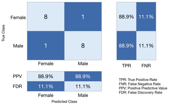 Confusion matrix for decision tree (boosted trees). A total of 18 of the 121 eggs were reserved to test the predictive accuracy of the model. The diagonal and off-diagonal cells of the matrix show the number of correct and incorrect predictions. The tables to the right and below the matrix display the true positive rates (TPRs), false negative rates (FNRs), positive predictive values (PPVs), and false discovery rates (FDRs). The TPR shows how accurately the model performed in each of the two classes and the FNR is the error rate. Of note, this model did not perform equally between the two sexes, leading to variations between the TPRs, FNRs, PPVs, and FDRs of each sex.
