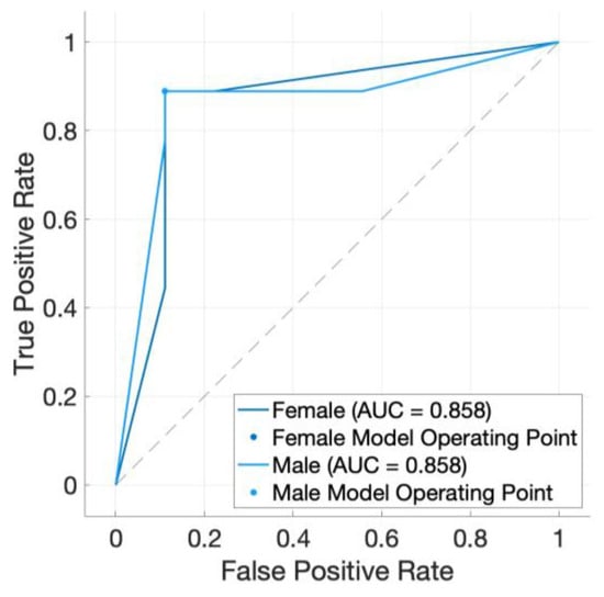 A confusion matrix [Figure 2] was created based on the wide neural network’s test results from trial 2 [Table 2] and shows the quality of the algorithm predictions. In this study, the positive predictive value and false discovery rate mirror the function of the true positive rate and false negative rate due to a coincidentally symmetrical testing set and model performance. A receiver operating characteristic (ROC) curve was also created based on the wide neural network’s performance from trial 2 [Figure 3]. Since the wide neural network performed identically between the two sexes, the model operating points and area under the ROC curve are the same. The value of 0.858 for the area under the ROC curve demonstrates strong model performance. Our findings reveal that the wide neural network had the capability to predict both sexes with high and equal accuracy. For comparison purposes, confusion matrices and ROC curves were created for the other three models in trial 2 [Appendix A Figure A2, Figure A3, Figure A4,Figure A5, Figure A6 and Figure A7.