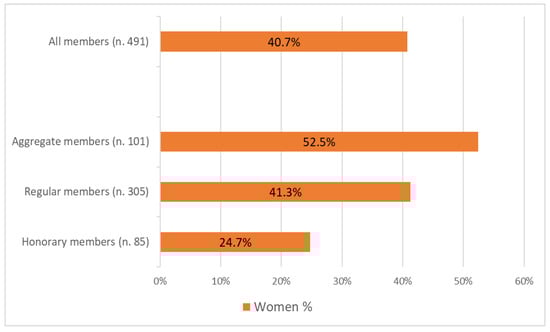 In 2023, the Association for Science and Animal Production counted a total of 491 members, considering only individuals and excluding organizations. Members were classified into three categories: honorary members (retired members), regular members, and aggregate members. According to ASPA’s statute, aggregate members are young individuals undergoing training in animal science research, including doctoral students, research fellows, and grant holders. Upon completing their training and transitioning to stable positions as researchers, they become regular members. Figure 1 illustrates the percentage of women within the entire association and across the three membership groups. When considering only aggregate and regular members (excluding honorary members), women account for 46.5%. Among aggregate members, the proportion of women is 52.5%, markedly exceeding the overall average.