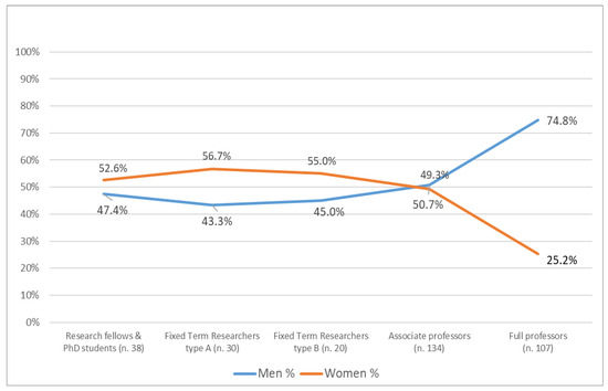 The diagram highlights the typical “scissor-like” trend that characterizes the male-to-female ratio at different career levels: the female component consistently dominates in lower-level positions but becomes a minority in higher-level positions, as confirmed also by the glass ceiling index, which is equal to 1.7. The balance point corresponds to the position of associate professor. This trend, with some differences, is also confirmed at the national level concerning academic staff in 2020 [13]. A similar trend among academic staff is also reported at the European level [14]. According to this report, while the overall percentage of women in academic roles is generally close to parity, the representation of women significantly decreases in higher positions. In 2018 (EU-27), the proportion of women declined from nearly half (46.6%) in grade C positions (PhD holders) to 40.3% in grade B (more senior) positions. There was a further decline to approximately one-quarter of women (26.2%) in the grade A positions, which represents the highest grade at which research is typically conducted within the institutional or corporate system. Moreover, it should be emphasized that from 2015 to 2018, the improvement at the European level appears minimal, indicating a prolonged path toward gender parity. In Italy in 2018, only 23.7% of grade A positions in academic environments were held by women.