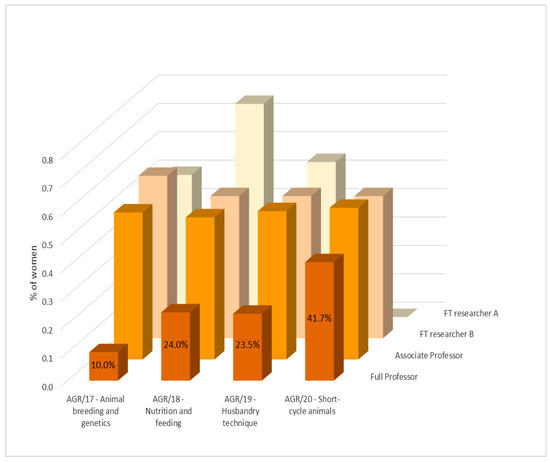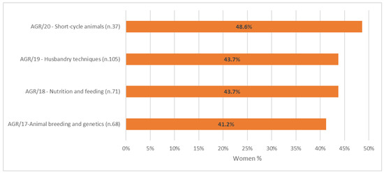 The percentages of women reported in Figure 4 reflect the proportion of women present in the four SDSs at the national level in the Italian university system. Overall, women constitute 45.9% of the total, and the percentage of women among full professors is 12.5% in AGR/17, 30.8% in AGR/18, 26.3% in AGR/19, and 58.3% in AGR/20, based on data from the official website of the Italian university system [26,27]. It is worth noting that the EU defines gender parity as a 50:50 ratio and gender equality as a proportion between 40 and 60%. In the case of full professors, there is an evident inequality as confirmed by the glass ceiling index which exceeds 1 in three out of the four SDSs.
