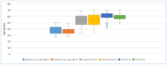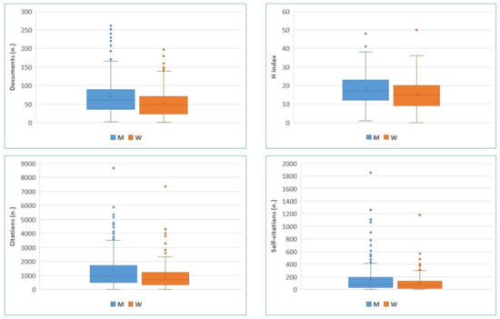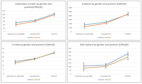 The results concerning positions and age align with expectations: as careers progress, the parameters under consideration tend to increase, as illustrated in Figure 6. Notably, among male full professors, there are more outliers in the younger age bracket, hinting that men often advance more swiftly in their careers and attain higher positions earlier compared to women. Several longitudinal studies have linked the gender gap in bibliometric performance to women’s shorter career durations [33], a higher representation of women in teaching-intensive and part-time positions [34], and fewer women in the top positions where both genders achieve the highest performance [35].
