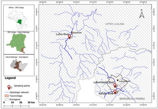 This study was carried out in the south of the former Katanga province in the Upper Congo Basin, especially (I) in the Upper Lualaba Ecoregion (sensu Thieme et al. []) in the Lufira River, which is a major tributary of the Lualaba River [,], and (II) in the Bangweulu–Mweru Ecoregion (sensu Thieme et al. []) in (i) the Lubumbashi River, which originates west of the city of Lubumbashi and flows into (ii) the Kafubu River, which is a tributary of the Luapula River (Figure 1).