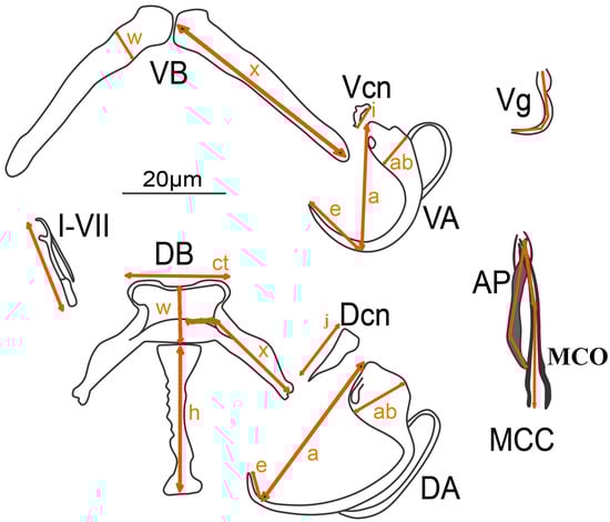 Morphometrics of Quadriacanthus spp. used in this study are based on Gussev [] with modifications by N’Douba et al. []. MCO: male copulatory organ length; AP: accessory piece length; MCC: male copulatory complex (MCO and AP combined); I–VII: hook length; DB: dorsal bar: (x) length, (w) width, (h) median process length, (ct) centre length; DA: dorsal anchor: (a) length, (ab) base diameter or width, (e) point length; DCn: dorsal cuneus (j) length; VB: ventral bar: (x) length, (w) width; VA: ventral anchor: (a) length, (ab) base diameter or width, (e) point length; VCn: ventral cuneus (i) length; Vg: vagina length [].