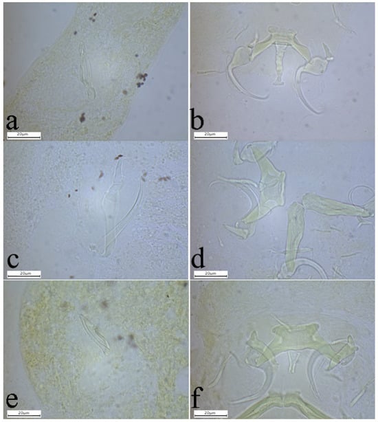 The investigation of gill filaments resulted in the record of eight monopisthocotylan species (Table 2). The morphology of the monogeneans found corresponds to the diagnosis of Quadriacanthus following Paperna [] and amendments by Kritsky and Kulo []. Among these eight monopisthocotylan species recorded, five are known (Q. aegypticus El-Naggar & Serag, 1986, Q. allobychowskiella Paperna, 1979, Q. amakaliae Kasembele, Bahanak & Vanhove, 2024 (Figure 3a,b), Q. domatanai Kasembele, Bahanak & Vanhove, 2024 (Figure 3c,d), Q. halajiani Kasembele, Bahanak & Vanhove, 2024 (Figure 3e,f)) [,,] and three (Q. kalomboi n. sp., Q. bassocki n. sp. and Q. shigoleyae n. sp.) are newly described (see Table 2; Figure 4, Figure 5, Figure 6 and Figure 7). Descriptions of new species are given below, and the infection parameters of all the retrieved species are provided in Table 2. No monopisthocotylan parasite was found on the gills of C. stappersii from Lubumbashi River nor from the gills of C. theodorae from both Lubumbashi and Kafubu rivers.