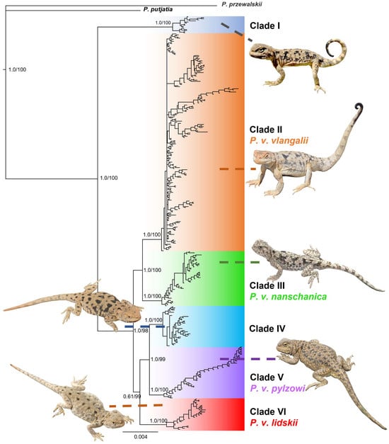 Jin et al. [27] pioneered the use of mitochondrial DNA (mtDNA) genetic markers to clarify the phylogenetic relationships of the viviparous group within the genus Phrynocephalus on the QTP. Their research recognized three distinct subspecies of P. vlangalii with discontinuous distribution and evidence of long-term genetic isolation: P. v. vlangalii, P. v. nanschanica, and P. v. pylzowi. This finding questioned the validity of other proposed subspecies and suggested reclassifications, including P. v. lidskii as a synonym of P. forsythii, P. v. hongyuanensis as a synonym of P. v. pylzowi, P. v. grombtschewskii and P. roborowskii as synonyms of P. v. vlangalii, and the establishment of P. v. parva as a subspecies of Phrynocephalus erythrurus (P. erythrurus parva) [27,28]. More recently, Chen et al. [12] discovered a previously undescribed and genetically distinct population in Gonghe County, Qinghai. However, their study did not extend to the northern slopes of the Kunlun and Arjin mountains, where unique Phrynocephalus specimens were collected. These lizards show clear morphological differences from sympatric P. forsythii and a greater similarity to P. vlangalii. This challenges their previous classification as P. v. lidskii and adds to the ongoing debate about their taxonomic status.