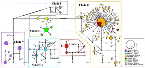 For nuDNA, we obtained 86 haplotype sequences after excluding Clade I (Gonghe County lineage), Clade V (Yellow River headwaters, P. v. pylzowi), and part of Clade II (Qaidam Basin, P. v. vlangalii) from the mtDNA phylogenetic tree. The haplotype network was reconstructed using the median-joining method [61]. Due to the conservation of nuclear gene sequences, the mtDNA-based topological structure was not well-supported in the nuDNA haplotype network (Supplementary Materials, Figure S1). Additionally, common haplotypes were observed between different clades, such as between Clade II and Clade III, and between Clade IV and Clade VI.