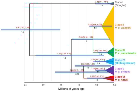 The first analysis of divergence times within the genus Phrynocephalus, as depicted in Figure S2, indicates that P. vlangalii diverged from other Phrynocephalus species during the Pliocene epoch (~2.55 Ma, 95% HPD: 1.78–3.39 Ma). The MRCA of P. vlangalii was dated to the early Pleistocene (~2.36 Ma; 95% HPD: 1.50–3.16 Ma), as shown in Figure 4. The earliest divergence within P. vlangalii was identified as Clade I, the population from Gonghe County. The remaining P. vlangalii populations split into two major clusters around 1.19 Ma (95% HPD: 0.28–2.19 Ma). One of these clusters included clades II and III, which diverged around 0.59 Ma (95% HPD: 0.10–1.17 Ma). Among the remaining clades, clades IV and V diverged approximately 0.53 Ma (95% HPD: 0.09–1.09 Ma). Support for the differentiation of Clade VI relative to other clades is low (PP = 0.37), and its estimated time of divergence from other branches is around 0.85 Ma (95% HPD: 0.15–1.65 Ma).