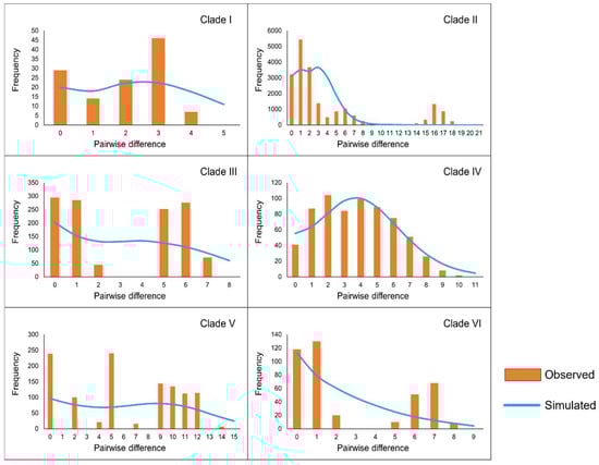 Results of the mismatch distribution analysis for each clade. Orange bars represent the pairwise differences in the observed distribution, and blue lines represent the theoretically expected distribution under a population expansion model.