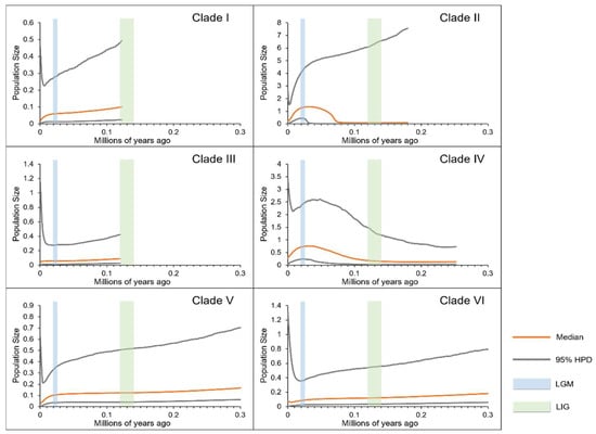 Bayesian skyline plots for each clade. The y-axes represent the estimated effective population size on a logarithmic scale (Ne*τ/106, the product of the female effective population size and generation length in years); the x-axes represent time in millions of years ago. The vertical blue and green bars represent the duration of the Last Glacial Maximum (LGM) and the Last Interglacial (LIG), respectively.