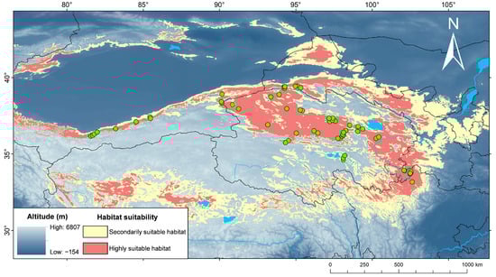 Occurrence data, comprising 69 localities, were compiled from fieldwork and previous studies with precise coordinates (Table S7). To reduce spatial bias, we used SDMtoolbox v2.5 [54] in ArcGIS to filter the dataset, ensuring that no two localities were closer than 10 km, resulting in 56 localities. The study area was defined by a minimum bounding rectangle around the localities with a 5° buffer [55,56], covering the known range of P. vlangalii from 76 to 107° E and from 28 to 44° N.