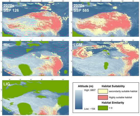 We obtained 19 climate variable factors for the following five different time periods from the WorldClim database (http://www.worldclim.org (accessed on 15 August 2023)) [48]: the present (1960–1990), the last interglacial (LIG, 0.12–0.14 Ma), the Last Glacial Maximum (LGM, ~0.02 Ma), the middle Holocene (MH, ~6000 years ago), and the future 2070s (2061–2080). The LGM data had a resolution of 2.5 arc-minutes, while the others were all 30 arc-seconds. We chose the Model for Interdisciplinary Research on Climate (MIROC) for the LGM and MH and applied it under the Shared Socio-economic Pathways 126 and 585 (SSP 126/585) for the 2070s, representing the lowest and highest carbon emission situations.