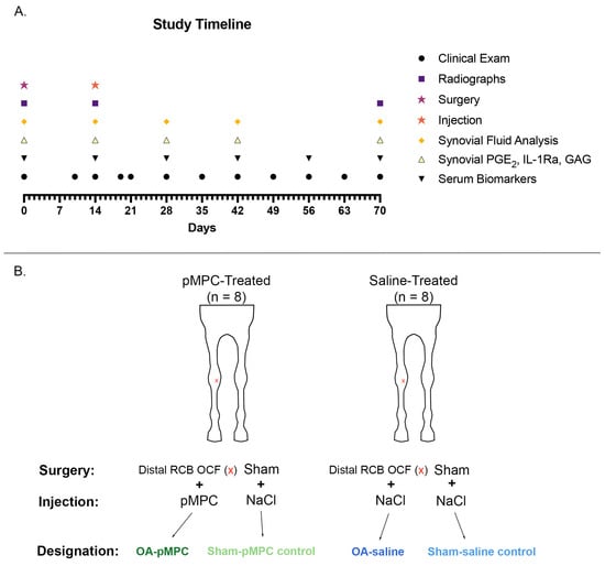 (A) Study timeline in days. (B) The study design consisted of 16 horses in total, including 8 horses in the polyacrylate (pMPC)-treated group, and 8 horses in the saline-treated group. For each horse, one randomly selected limb (n = 8 left, n = 8 right) was designated for the induction of OA by creating an osteochondral fragment (OCF) in the distal aspect of the radial carpal bone (RCB) as indicated by the red X; the other limb was sham-operated. On day 14 postoperatively, each OA limb was injected with either 6 mL pMPC (n = 8) or 6 mL saline (n = 8); all sham-operated limbs were injected with 6 mL saline (n = 16).