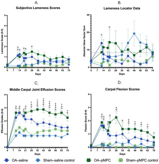 Clinical data with (A) subjective lameness scores, (B) lameness locator data, (C) middle carpal joint effusion scores, and (D) carpal flexion scores for each forelimb throughout the study period. The mean +/− SEM is represented at each evaluation timepoint. Surgery is represented by day 0, and injections were performed on day 14. For all graphs, ψ represents days for which OA–pMPC limbs had significantly greater lameness/effusion/flexion scores than their sham-operated counterpart (Sham–pMPC control); δ represents days for which OA–saline limbs had significantly greater lameness/effusion/flexion scores compared to their sham-operated counterpart (Sham–saline); * represents days OA–pMPC had significantly different effusion/flexion scores than OA–saline limbs; and + represents days effusion/flexion scores were significantly lower than baseline day 14 scores for OA–saline limbs. For lameness locator data, clinical lameness is considered for values greater than 8.5 mm, as indicated by the dotted line in (B).