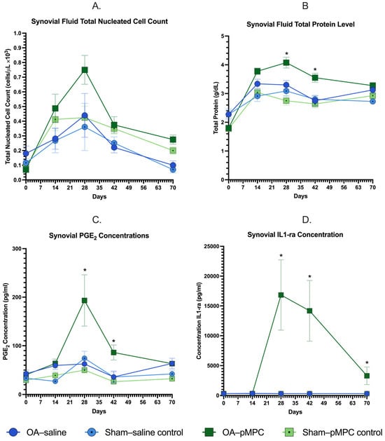 (A) Synovial total nucleated cell count, (B) Total protein, (C) Prostaglandin E2 (PGE2), and (D) Interleukin 1 receptor antagonist protein (IL-1ra) concentrations. The mean +/− SEM is represented at each evaluation timepoint. Surgery is represented by day 0, and injections were performed on day 14. * represents days synovial concentrations of protein, PGE2, or IL1-ra were significantly different for OA–pMPC- and OA–saline-treated joints.
