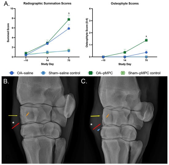Radiographic examination of both carpi of study horses was performed 10 days prior to the start of the study and again on days 14 and 70 postoperatively. (A) Summation scores for all evaluated parameters and osteophyte scores on days −10, 14, and 70. Summation scores were elevated on day 70 for joints with induced OA (δ, p < 0.0001); pMPC-treated versus saline-treated summation scores were not significantly different. Osteophyte scores were overall low but significantly higher for OA–pMPC limbs compared to OA–saline limbs on day 70 (*, p < 0.0001). (B,C) Day 70 dorsolateral–palmaromedial radiograph of OA–saline (B) and OA–pMPC (C); osteochondral fragments (red arrows), sclerosis of the radiocarpal bone (orange arrows), joint capsule enthesopathy (yellow arrows), and joint effusion (white asterisks) were evident in both horses. Osteophytosis (blue arrow) was more prominent in OA–pMPC joints.
