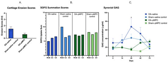 A potential cartilage protective effect by pMPC is highlighted by lower full thickness erosion scores on gross pathology (A). Furthermore, GAG concentrations were higher in OA–pMPC joints compared to OA–saline joints although not significantly different (B). Synovial GAG concentrations were higher for OA–saline joints compared to OA–pMPC joints on day 28 (*), suggesting that GAG was retained in the cartilage of OA–pMPC joints and not degraded into the synovial fluid (C). In (B), RCB stands for radiocarpal bone, C3 for third carpal bone, and C4 for fourth carpal bone within the middle carpal joint.