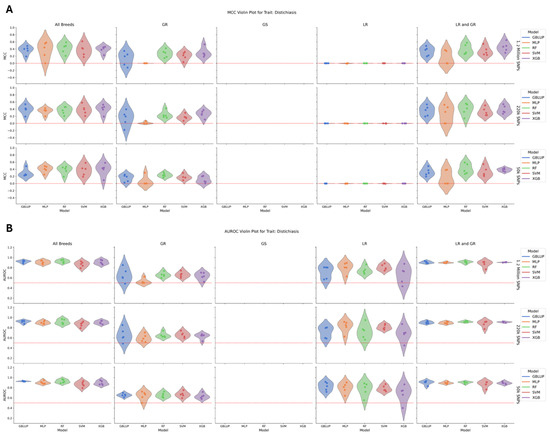(A) A violin plot of model performance by MCC for distichiasis. The data are partitioned by SNP dataset in the rows and breed group in the columns with the models colored as follows: GBLUP—blue, MLP—orange, RF—green, SVM—red, and XGB—purple. The red dotted line represents the expected performance of a totally naïve model with an MCC of 0. There was no significant difference in model performance within each breed group/SNP dataset. (B) A violin plot of model performance by AUROC for distichiasis. The data are partitioned by SNP dataset in the rows and breed group in the columns with the models colored as follows: GBLUP—blue, MLP—orange, RF—green, SVM—red, and XGB—purple. The red dotted line represents the expected performance of a totally naïve model with an AUROC of 0.5. There was no significant difference in model performance within each breed group/SNP dataset.
