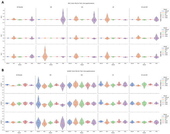 (A) A violin plot of model performance by MCC for oral papillomatosis. The data are partitioned by SNP dataset in the rows and breed group in the columns with the models colored as follows: GBLUP—blue, MLP—orange, RF—green, SVM—red, and XGB—purple. The red dotted line represents the expected performance of a totally naïve model with an MCC of 0. There was no significant difference in model performance within each breed group/SNP dataset. (B) A violin plot of model performance by AUROC for oral papillomatosis. The data are partitioned by SNP dataset in the rows and breed group in the columns with the models colored as follows: GBLUP—blue, MLP—orange, RF—green, SVM—red, and XGB—purple. The red dotted line represents the expected performance of a totally naïve model with an AUROC of 0.5. There was no significant difference in model performance within each breed group/SNP dataset.