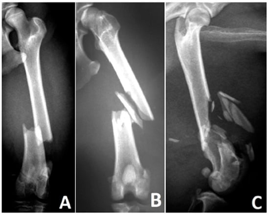 Types of diaphyseal fractures in a canine femur—(A) simple fracture, (B) wedge fracture, (C) complex fracture, according to Unger et al. (1990) 6.