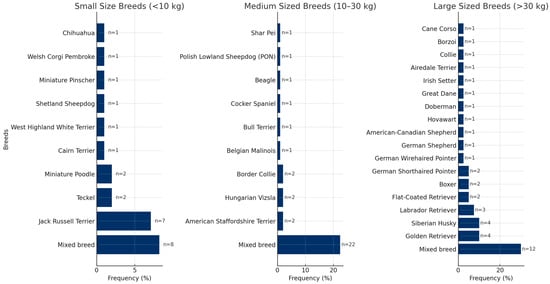 Table 2 highlights the distribution of comminuted fractures across different bones and their respective percentages, while Figure 4 provides the breed distribution of the patients with comminuted fractures, categorized by size groups and including the number of cases and percentages.