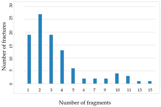 In total, 357 fragments were counted across 99 fractures (an average of 3.6 fragments per fracture). The distribution of fragments by size and their frequency across different bones and open fractures is shown in Figure 6.