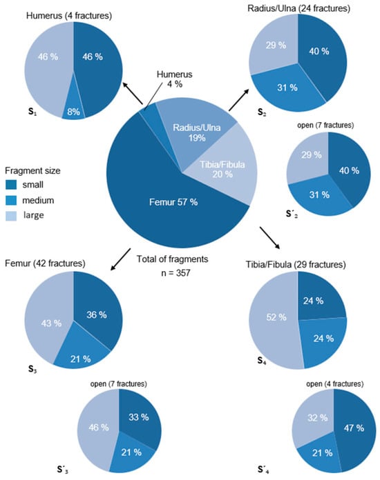 The 366 fragments from the 99 comminuted fractures and their percentage distribution across the four long bones of the limbs are shown in the center of the graphic. The pie satellites (S) indicate the percentage of large, medium, and small fragments for the humerus (S1), radius/ulna (S2), femur (S3), and tibia/fibula (S4). The smaller satellites display the number of open fractures and the size of their fragments for the radius/ulna (S’2), femur (S’3), and tibia/fibula (S’4).