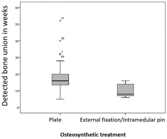 After plate osteosynthesis, the implants could be removed significantly later compared to intramedullary osteosynthesis or external fixation (p = 0.049), as shown in Figure 10. However, no significant differences were found regarding age within the implant groups (p-value in Plate Group = 0.961; p-value in Intramedullar-external fixator group = 1.000).