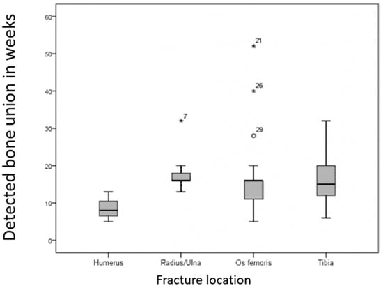 Complications were diagnosed, on average, 7.4 weeks (range: 2–360 days) post-operation. In patients with uncomplicated healing, the fracture gap was no longer radiologically visible after an average of 14.6 weeks (5–32 weeks; median: 15.0 weeks). In patients with complications, the fracture gap closed after an average of 22.2 weeks (8–52 weeks; median: 16.0 weeks). This difference was statistically significant (p-value = 0.014).