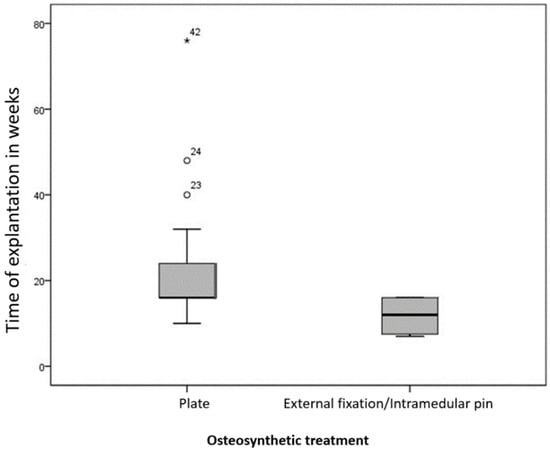 Time of implant removal (in weeks) post-operation for animals treated with plate osteosynthesis (n = 38) and intramedullary/external fixation osteosynthesis (n = 4). Implants were removed significantly later after plate osteosynthesis compared to intramedullary or external fixation (p = 0.049).