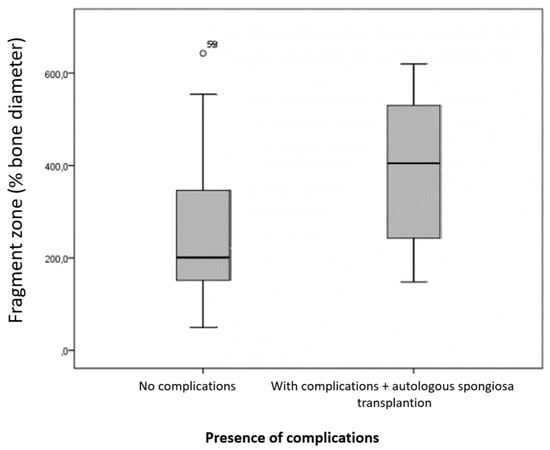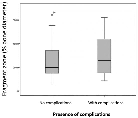 Size of the fragment zone in relation to bone diameter in animals without complications (n = 57) and with complications (n = 22). The difference compared to animals without complications was not statistically significant (p = 0.227).