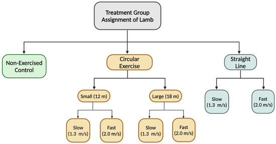 All use of animals was approved by the Michigan State University Institute of Animal Care and Use Committee (IACUC PROTO202200234; approved 16 September 2022). Forty-two lambs (21 ewes and 21 wethers) aged 4 ± 1 mo with an average weight of 40 ± 1 kg were obtained from the Michigan State University Sheep Teaching and Research Center. On d 0, lambs were measured for weight and height then striated into one of seven treatment groups. Each treatment group was composed of 6 animals: 3 ewes and 3 wethers. Exercise was conducted 4 d/wk for 12 wk on a mechanical walker (circular exercise) with a diameter of 12 m (small) or 18 m (large) or a treadmill (straight line) at a speed of 1.3 m/s (slow) or 2.0 m/s (fast) with one group serving as a non-exercised control (Figure 1). The footing in the walker was composed of approximately 5 cm of 2NS sand on a crushed asphalt base. Circularly exercised animals tracked right (clockwise) to ensure the inside and outside limbs remained consistent. With this, for the circularly exercised groups, the left leg was always the outside leg, and the right leg was always the inside leg. Further, clockwise was chosen as the exercise direction for ease of loading sheep into the walker as the design of the entryway encouraged them to track right. Animals started exercising at 390 m/d, which increased by 390 m weekly until they reached 2340 m/d (Table 1). When not exercising, animals were housed in two straw-bedded pens with areas of 35 m2 and 33 m2 that allowed for ad libitum access to clean water and hay. Animals were fed a grain–mineral mix once daily at a rate of 0.65 kg/hd/d.
