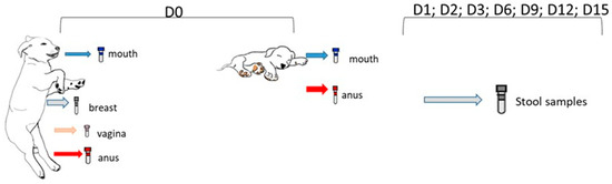 Samples from the mouth and anus of newborns were collected using sterile swabs immediately after the rupture of the amniotic membrane (M1). The surgeon and their assistant performed the collection and promptly handed over the swabs to another assistant, who was equipped with sterile gloves and compresses. The newborns were enumerated and identified by birth order, and samples were obtained from the first two and the last two puppies, totaling twelve puppies. Fecal samples from newborns were collected in the first three days after birth and, subsequently, every 3 days for the initial 15 days of life.