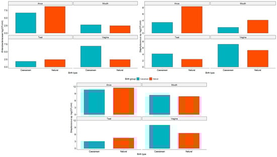The populations of Staphylococcus showed a similar pattern, with high counts found in the anus and vagina. However, a more significant increase in population growth was noted in the mouth and teats, particularly in bitches that underwent natural birth (4.08 ± 2.15 CFU/mL) and cesarean section (4.12 ± 2.23 CFU/mL), respectively (Figure 2). Although no significant difference was found between the delivery type (p < 0.05), Streptococcus, in general, represented the microorganisms with the largest populations, displaying minimal growth variation between the bitches that underwent cesarean section and natural birth (Figure 2).
