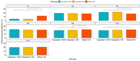 Graphical representation of enterobacteriaceae population on days 1, 2, 3, 6, 9, 12, and 15 postpartum in the cesarean section with seeding (cesarean/WS), cesarean section without seeding (cesarean/WOS), and normal birth (natural/NA). Asterisk (*) and (**): significant differences observed among the groups with p < 0.01 and p < 0.001, respectively, as determined by the Wilcoxon test.