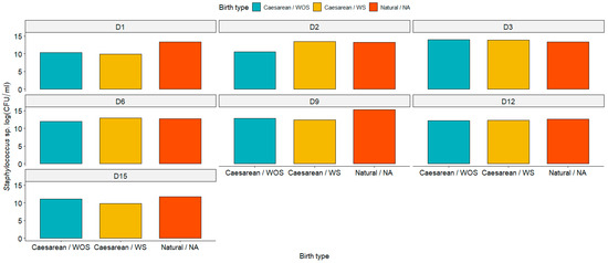 Graphical representation of Staphylococcus population on days 1, 2, 3, 6, 9, 12, and 15 postpartum in cesarean section with seeding (cesarean/WS), cesarean section without seeding (cesarean/WOS), and normal birth (natural/NA). No significant difference was observed among the groups (p > 0.05) according to the Wilcoxon test.